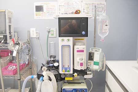 最新の人工呼吸器を備えた麻酔器で、患者の心肺に負担をかけないように麻酔を維持しながら手術を行っています。