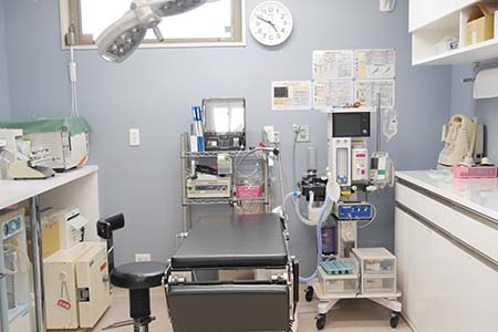 電気メスや超音波メス、半導体レーザーなど、各種手術機器を完備し、できるだけ負担の少ない手術を行っています。手術に用いる器具はオートクレーブとガス滅菌機を用いて常に無菌状態にしており、患者の体や術者には使い捨てのドレープ・ガウンを用いて感染対策を徹底しています。