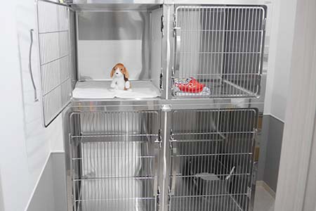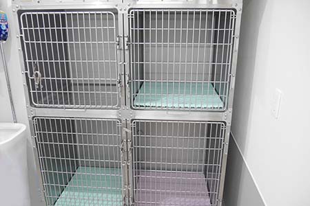 大型犬も入院できる広いケージを使用しています。入院室の入り口はガラス張りで、外から状態が確認できる入院室になっています。